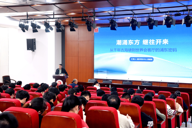 主题讲座环节,吴建斌通过珍贵影像与口述史料,生动讲述了浦东新区从千年古海塘的壮阔景象逐步发展成为世界会客厅的现代风貌的历程。吴建斌带领听众穿越时空,回顾了对浦东发展有重要贡献的历史人物和英雄事迹,让大家深刻感受到这片热土如何以深厚的历史底蕴为墨、以与时俱进的时代智慧为锋,书写属于中国的现代化传奇。