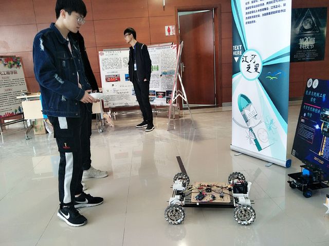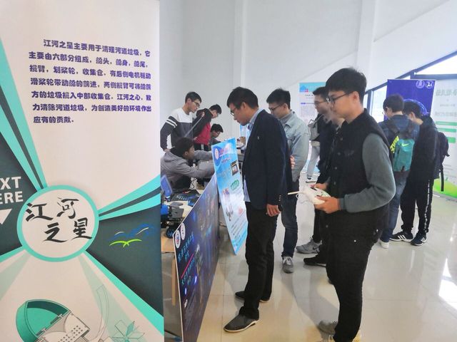 随后各学院进行科技创新成果展示,tyc8722太阳集团所展示的,麦克纳姆轮小车引得在场学生驻足,河道清理型机械模型“江河之心”更引来学生的围观讨论,大学生创新创业协会副会长马泽细致的介绍两项作品的原理及用途。周长长老师莅临现场,与参加本次活动的上海市创造杯二等奖的获奖队伍进行深入交流,视频短片与动手体验相结合,周老师对本次展出作品给予了高度评价,对我们善于创新、乐于创造的同学给予了鼓励和并寄予厚望,希望我们能机学子在各项赛事中都能斩获更多佳绩,取得更大成功!
