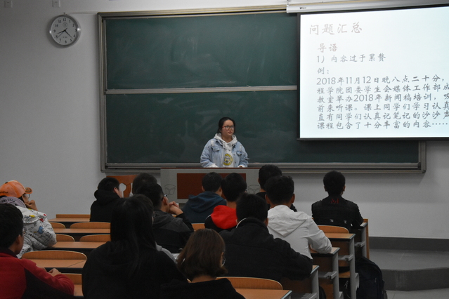 2018年11月20日星期二晚上8:20,能机学院新闻稿培训第二讲在三教210成功举行。此次培训由媒体工作部副部长周盈辛主讲,各班宣传委员及各部门干事参与了培训。