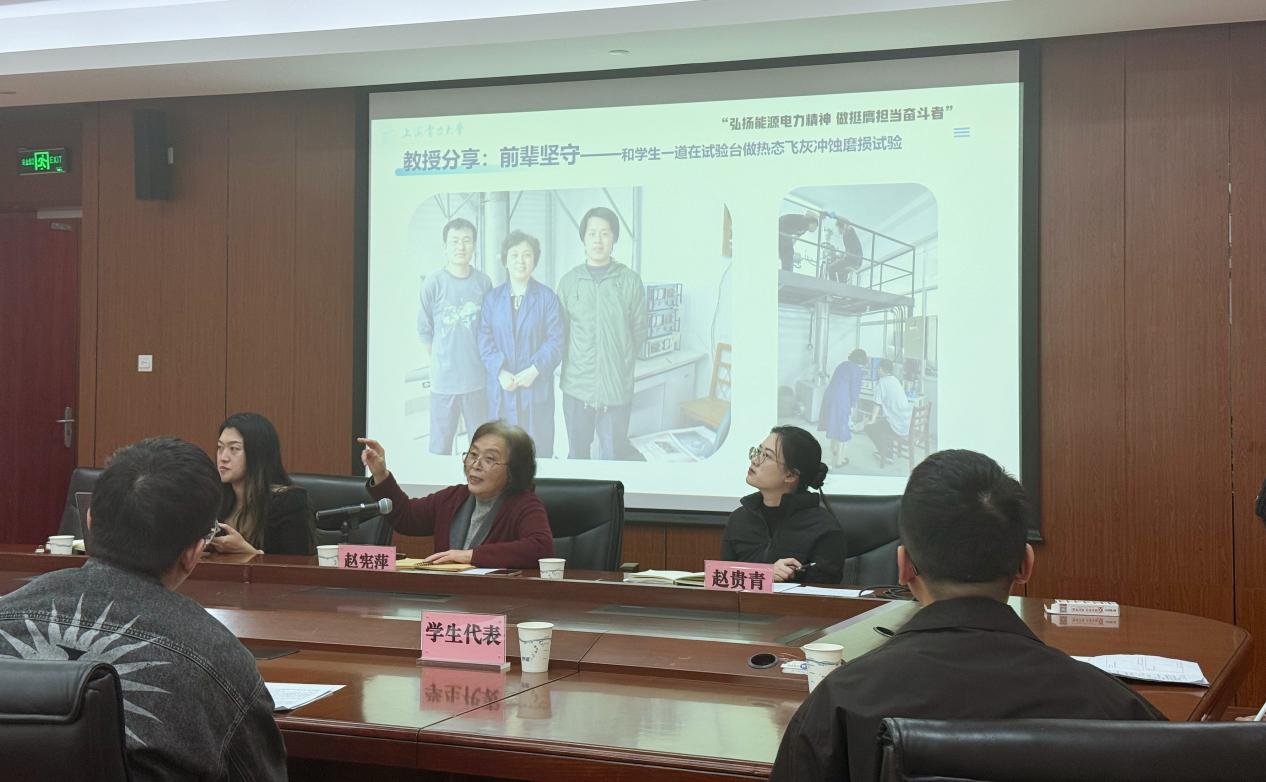 分享环节,赵宪萍教授结合数十载教学科研经历,以“坚守初心、深耕不辍”为主线展开分享。她回顾从电力设计院到高校的职业历程,重点讲述搭建热态飞灰冲蚀磨损试验台的两年攻坚经历——从设计选型到调试运行,全程严控细节;面对跨学科难题时,积极联动化学、自动化、金属材料等领域师生协同突破。结合审稿经历,她叮嘱同学们尊重原创、严谨引用,保持对学术真理的敬畏。她寄语学生“研究生阶段要扎实功底、锤炼思维,在传承中创新。”