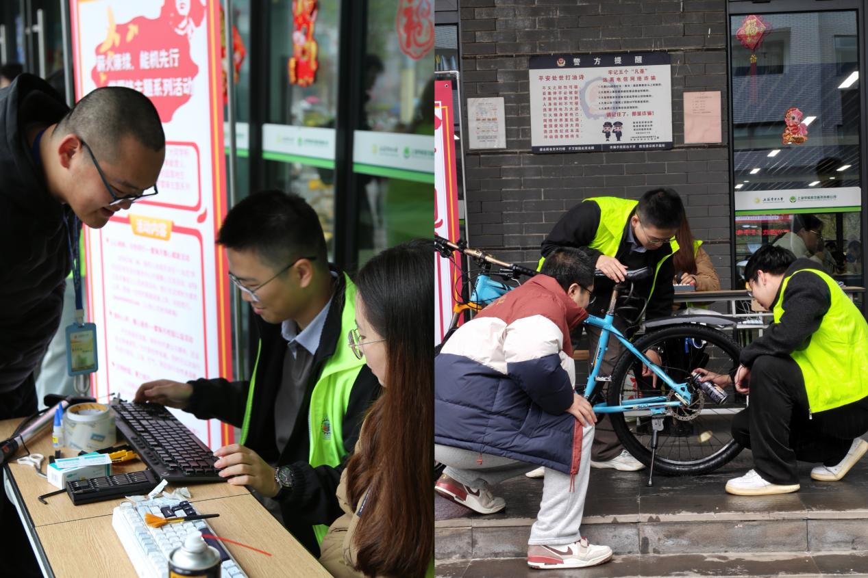 中午的校园公益服务现场热闹非凡。学院特设“能机信箱”,广泛征集同学们对校园建设的意见建议与美好期盼,搭建起学院与学生沟通交流的暖心桥梁;在义务维修区,志愿者们热情饱满、细致专业,为同学们提供键盘等小型电器维修、自行车调试、上油、打气等服务,用专业技能传递公益温暖,让校园处处洋溢着温情。。