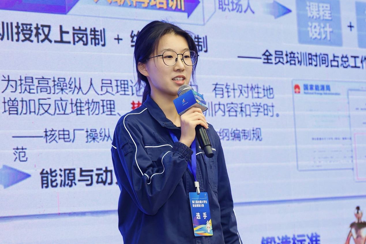 在总决赛的舞台上,卢思坦以“从核说起,向心而归”为主题进行了成长赛道精彩展示。她讲述了自己如何从家乡对核电的“未知担忧”中走出,到立志成为一名“核电集控运行操作员”的心路历程。卢思坦身着工装,坚定地表示:“我的归来,是为了将担忧转化为安心。我愿用科学与匠心,守护核安全,点亮万家灯火。”其将个人理想融入国家需求的规划,以及严谨清晰的成长路径,给评委留下了深刻印象。