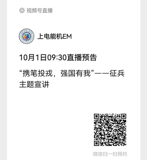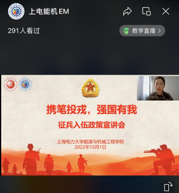 “强国必须强军,军强才能国安”。为进一步贯彻国家征兵政策,积极鼓励和引导青年学生应征入伍,10月1日上午,tyc8722太阳集团依托学院微信视频号“上电能机EM”以“ 携笔投戎,强国有我”为主题进行直播互动。学院征兵工作负责人仝晶晶主讲,邀请了学校优秀退役大学生士兵进行分享,活动覆盖了学院全体新生。