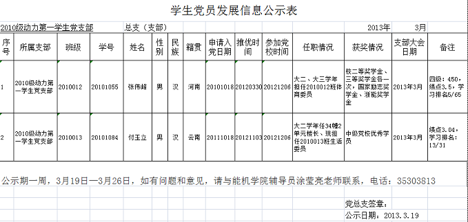2010动力第一学生党支部发展党员公示表