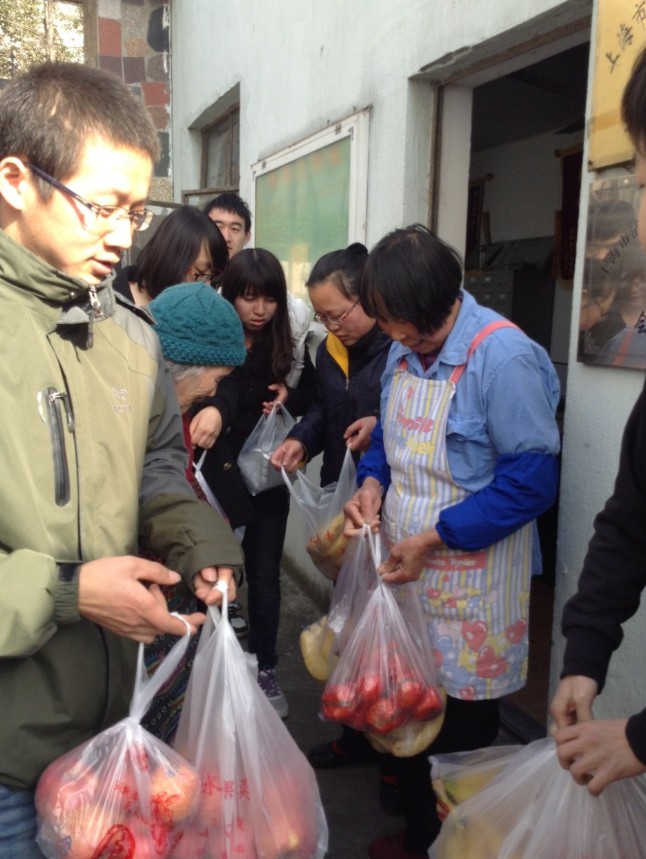 刚到那里,团员们就得到了热情的接待。在班委的积极领导下,参与活动的同学快速完成了分工。女生们首先负责切削水果,然后分盘送与各位老人品尝,顺便和他(她)们聊聊家常。男生们则主要为他们收拾收拾屋子,打扫打扫卫生。
