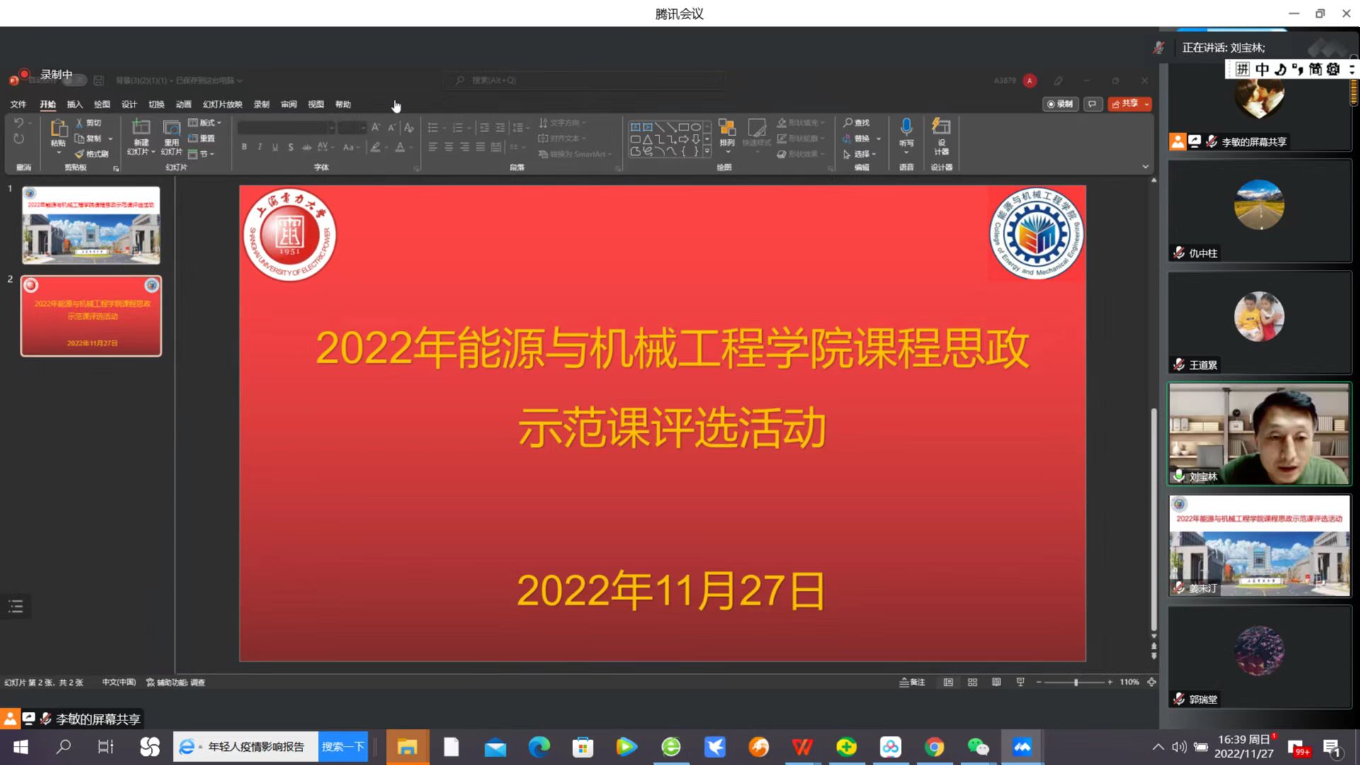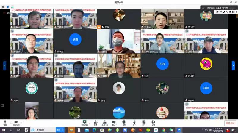为贯彻党的二十大精神,落实全国高校思想政治工作会议和《高等学校课程思政建设指导纲要》等文件精神,让学院所有教师、所有课程都承担好育人责任,切实提高每一位教师参与课程思政建设的积极性和主动性,全面形成广泛开展课程思政建设的良好氛围,全面提高人才培养质量,tyc8722太阳集团于11月27日举办2022年度课程思政示范课评选活动,副校长黄冬梅莅临致辞,能机学院党委书记潘卫国、院长朱群志以及学院骨干教师参加了本次活动,学院邀请了上海课程思政教学名师、上海理工大学的刘宝林教授,上海课程思政教学名师王鲁杨副教授和校院两级资深教学督导赵宪萍教授担任评审专家,副院长仇中柱主持会议。