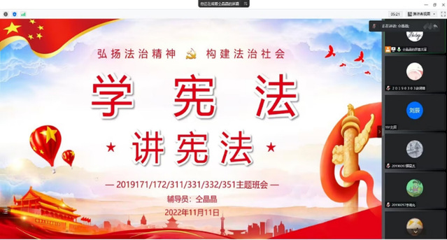 为促进广大青年学生领会我国宪法的重大意义、基本内容和主要精神,11月7日至11月18日,各年级辅导员聚焦于青年学子法治需求和关注的热点问题,围绕宪法教育、民法典、教育法律法规等方面,充分依托主题班会、团课讲堂等阵地开展主题宣讲,通过宪法知识讲解、观看微电影、“我对宪法说句话”等多种形式,引导学生了解宪法知识,树立和巩固国家安全意识、诚实守信意识,推动法治教育与青年学习成长成才实现“同频共振”。通过这次主题宣讲,切实增强了学生的法治观念,提升了广大学生的法治意识。