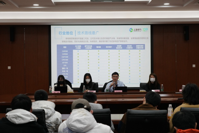 为了促进学生对于核电发展的认识与了解,加强校企之间的沟通和交流,12月7日上午,上海电气核电集团有限公司团委书记俞炯帆受邀在临港校区学术楼303会议室结合“当下核电发展及人才需求”开展主题讲座。上海电气核电集团有限公司培训主管王琛迪、第一机床厂有限公司张瑶、上海电气核电设备有限公司颜文瑞、能机学院核工程与核技术专业教师黄凯参会,会议由学院辅导员仝晶晶主持。
