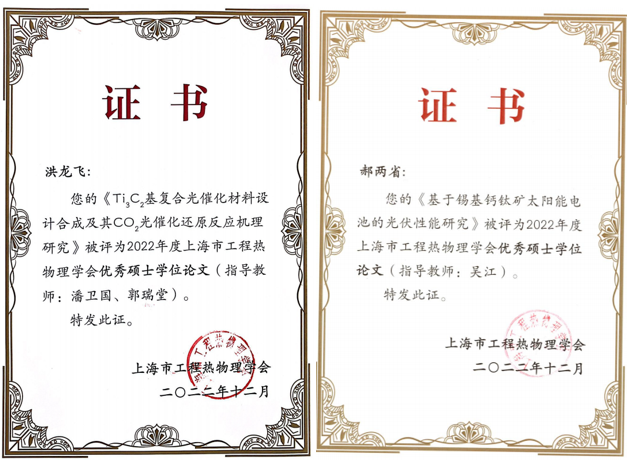 3月11日,上海市工程热物理学会2022学术年会暨第九届理事工作会议在我校杨浦校区小礼堂召开。会议颁发了2022年度上海市工程热物理学会优秀博士学位论文奖和优秀硕士学位论文奖,我校tyc8722太阳集团潘卫国教授和郭瑞堂教授指导研究生洪龙飞完成的硕士学位论文《Ti3C2基复合光催化材料设计合成及其CO2光催化还原反应机理研究》、吴江教授指导研究生郝两省完成的硕士学位论文《基于锡基钙钛矿太阳能电池的光伏性能研究》,荣获优秀硕士学位论文奖。