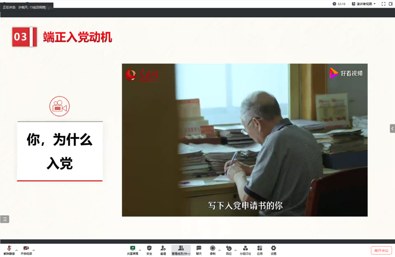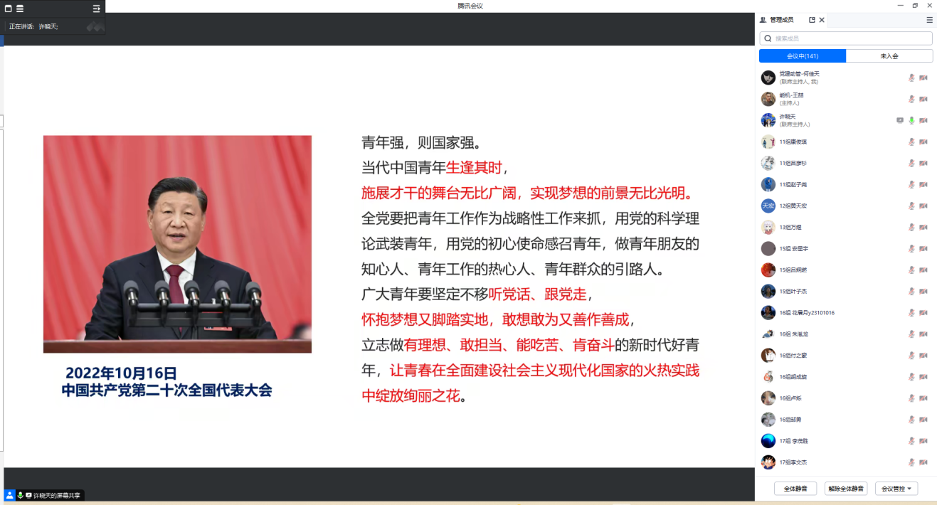 许晓天老师以觉醒年代作为切入点,引出青年才俊是党和国家发展的重要力量,并且引用习近平总书记在二十大对青年的勉励以及身边优秀的青年榜样来激励培训班全体学员争做有理想、敢担当、能吃苦、肯奋斗的新时代好青年。