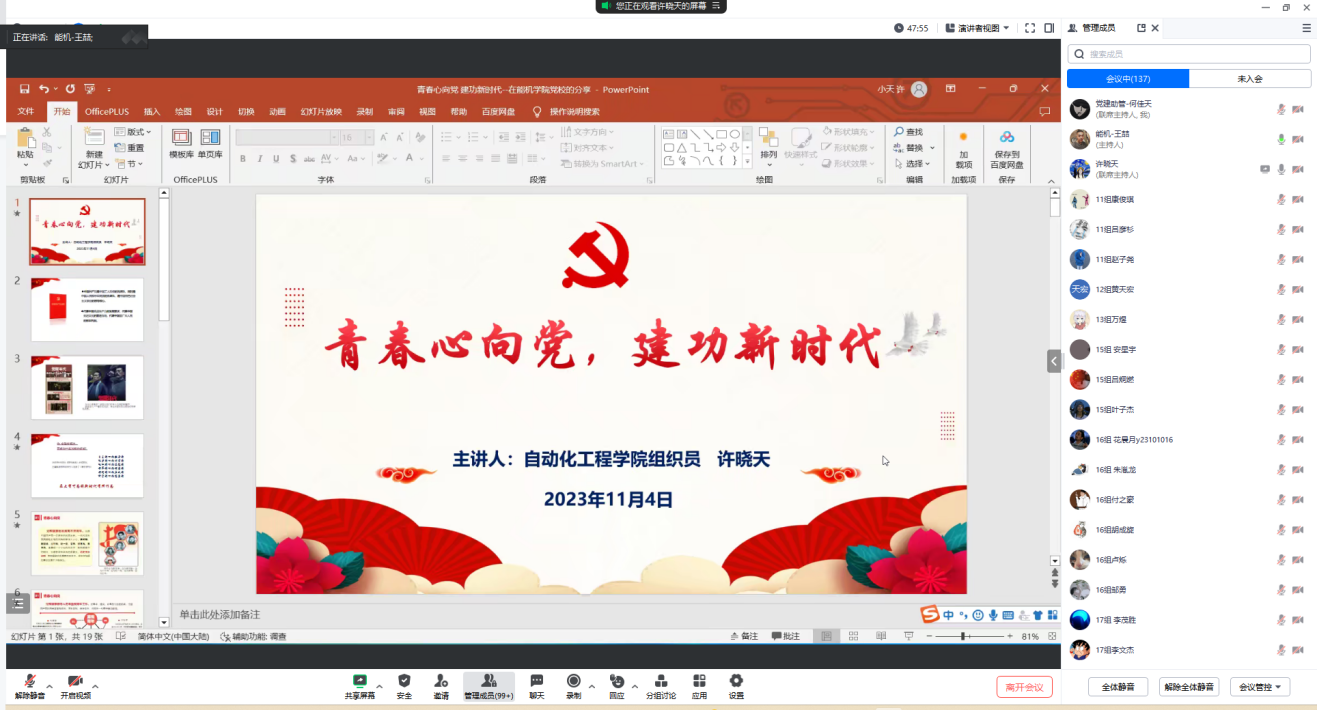 2023年11月4日,tyc8722太阳集团分党校开展第5期初级党校培训班第三讲。本次授课由自动化学院组织员许晓天老师主讲,开展了以“青春心向党,建功新时代”为主题的党课培训。会议由能机学院组织员王喆老师主持。