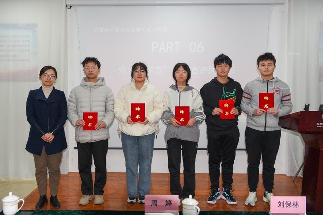 周婷为“学志”宣讲团的10名成员颁发聘书,激励同学们要不忘初心、牢记使命、学红色精神、立报国志向,成为可以担当民族复兴大任的时代新人。