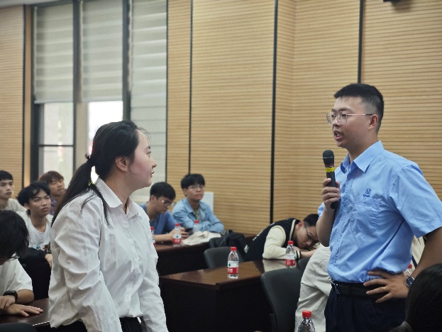 交流环节中,对于高年级学生关心的实习、就业等相关问题,沈宏辉详细介绍了秦山核电丰富的职能部门、详细的晋升规则以及员工的福利建设等,并表示欢迎新一代的年轻人能够加入我国的核电事业当中来。