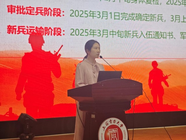 仝晶晶介绍学校征兵工作,详细解读了毕业生入伍的相关政策,号召同学们积极响应党和国家号召,应征入伍、兴国安邦,在军营中书写绚烂、无悔的青春篇章。