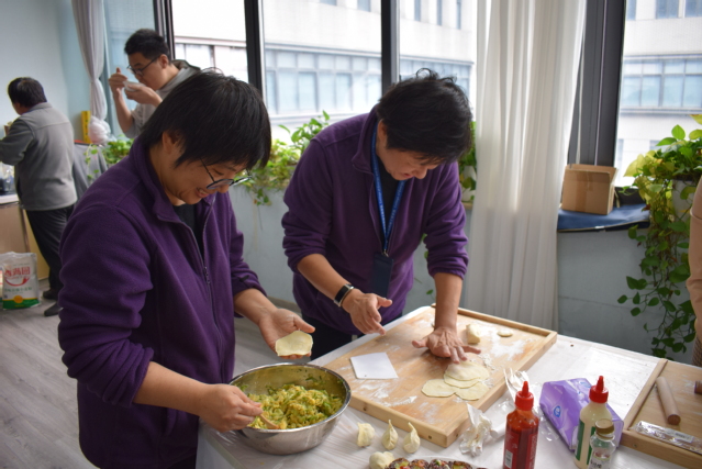 活动现场,老师们分工明确,配合默契,忙得不亦乐乎。有的老师手法娴熟地擀着饺子皮,一张张薄厚均匀的面皮在他们手中快速旋转;有的老师专注于揪面团,大小均匀的面团排列整齐;还有的老师则大显身手包着饺子馅,或捏出精致的褶子,或包出独特的形状,一排排独具个性的饺子很快摆满了餐盘,每一个饺子都饱含着老师们的欢乐与创意。整个过程中,大家相互交流包饺子的技巧,互帮互学,在协作中感受着冬日里的融融温情,现场气氛热闹非凡。
