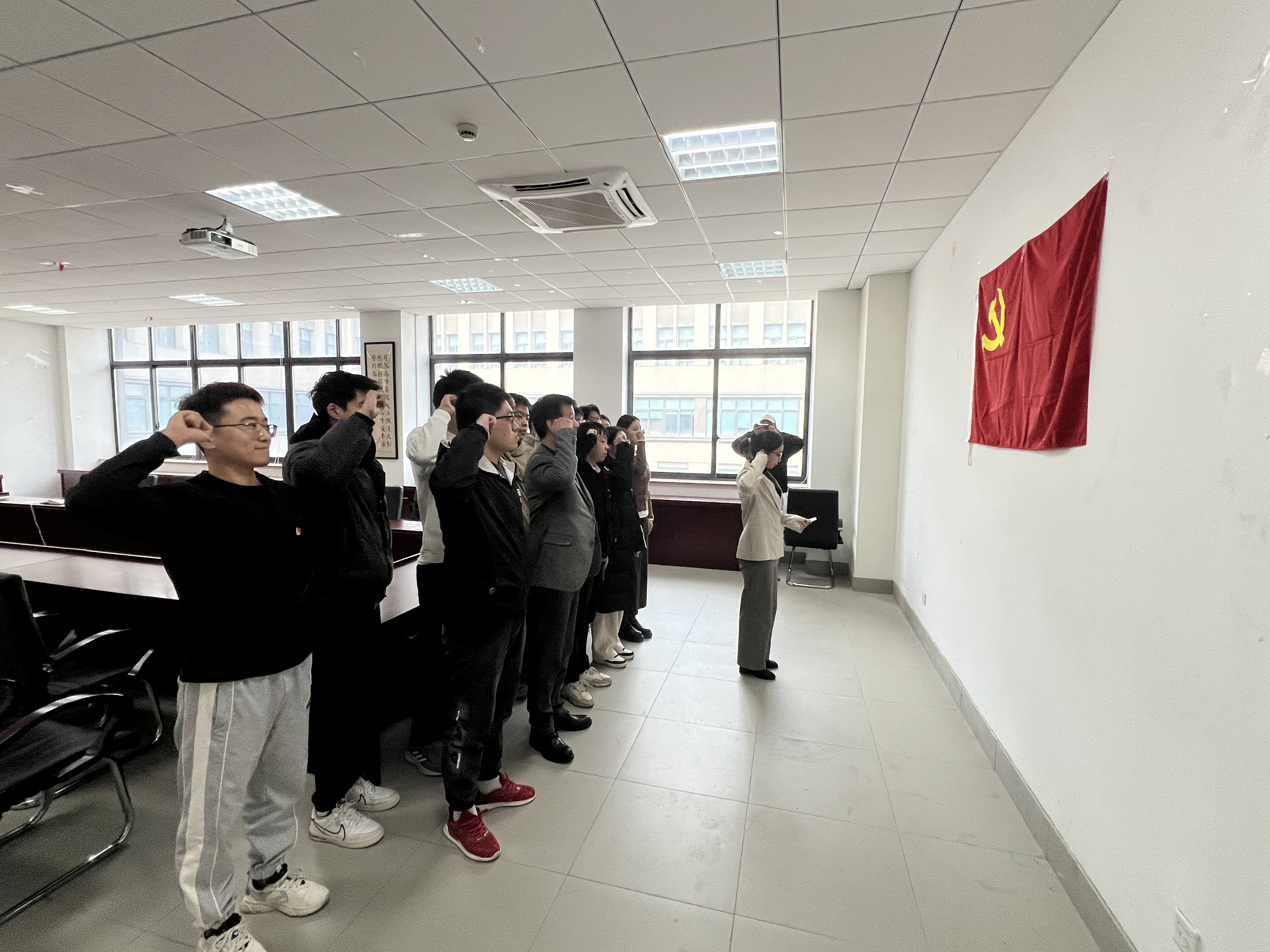 王喆宣读了《中共tyc8722太阳集团委员会关于批准刘鑫等17位同志为预备党员的备案报告》,周婷作为领誓人带领新吸收的预备党员面向党旗,进行庄严宣誓。